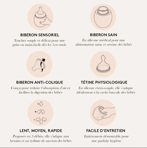 Biberon 150 ml, en silicone médical, doté d’une tétine physiologique débit Moyen