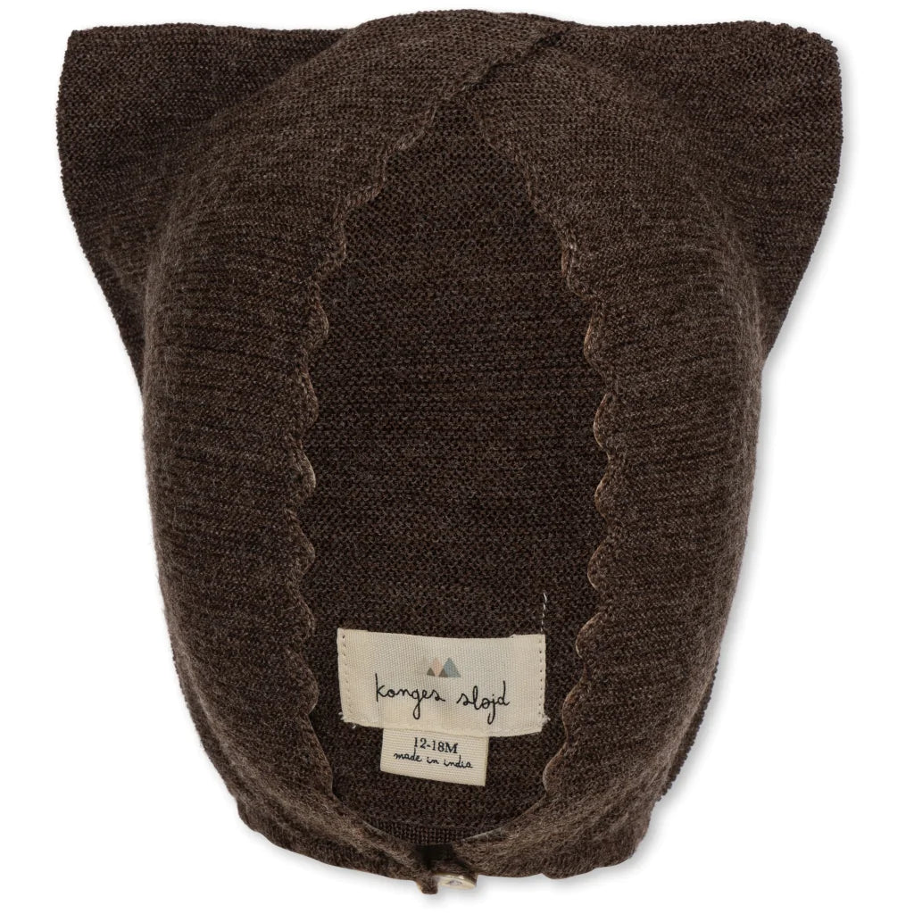 Casque tricoté doux en 100 pour cent laine douce conçu avec des bords festonnés. Se ferme sous le menton avec un seul bouton en nacre.