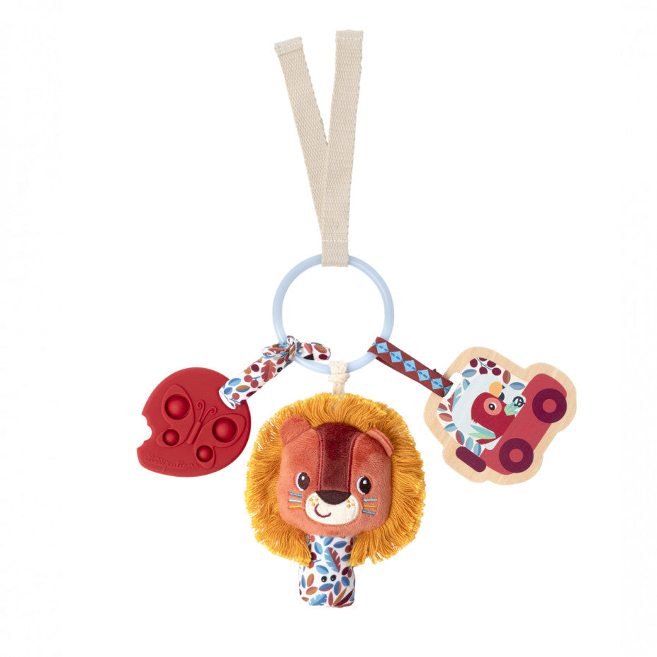 Le premier trousseau de bébé ! Sur le thème du jardin, ce trousseau d'activités Jeanne le chat est adapté aux petits dès l'âge de 3 mois. S'ils adorent les trousseaux de clés des adultes, qui produisent des sons captivants et sont faciles à manipuler, les bébés vont adorer ce trousseau et ses 3 jouets d'éveils conçus rien que pour eux. D'abord, un anneau de dentition en forme de feuille en silicone. Idéal à mordiller pour soulager les poussées dentaires, il est de couleur rose et propose également une activité de popping fascinante et relaxante. Ensuite, un joli hochet à faire tinter sous forme de peluche chat. Pour finir, une maisonnette abrite deux souris qui prennent le thé … Elle cache un miroir au verso ! Ce jouet d'éveil peut facilement être suspendu près de bébé pour toujours être à sa portée et l'amuser où qu'il soit. Grâce à lui, bébé développe sa motricité fine, son acuité visuelle et auditive, et explore par le toucher. Les couleurs apaisantes et les motifs cerises rappellent le jardin où notre félin adore passer ses journées. La variété des matières, des activités ainsi que son format, font de ce jouet premier âge un indispensable à emporter partout ! Ce jouet d'activités Lilliputiens mesure 25x20 cm et se compose de polyester, de silicone, de bois et de plastique. Il est lavable en surface uniquement.