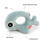 Le hochet en forme d'anneau fait un joli bruit de hochet lorsqu'on le secoue et les nageoires font un drôle de papier bruissant lorsqu'on les touche. Les ailettes permettent au hochet de tenir debout tout seul et conviennent à l'heure du ventre.