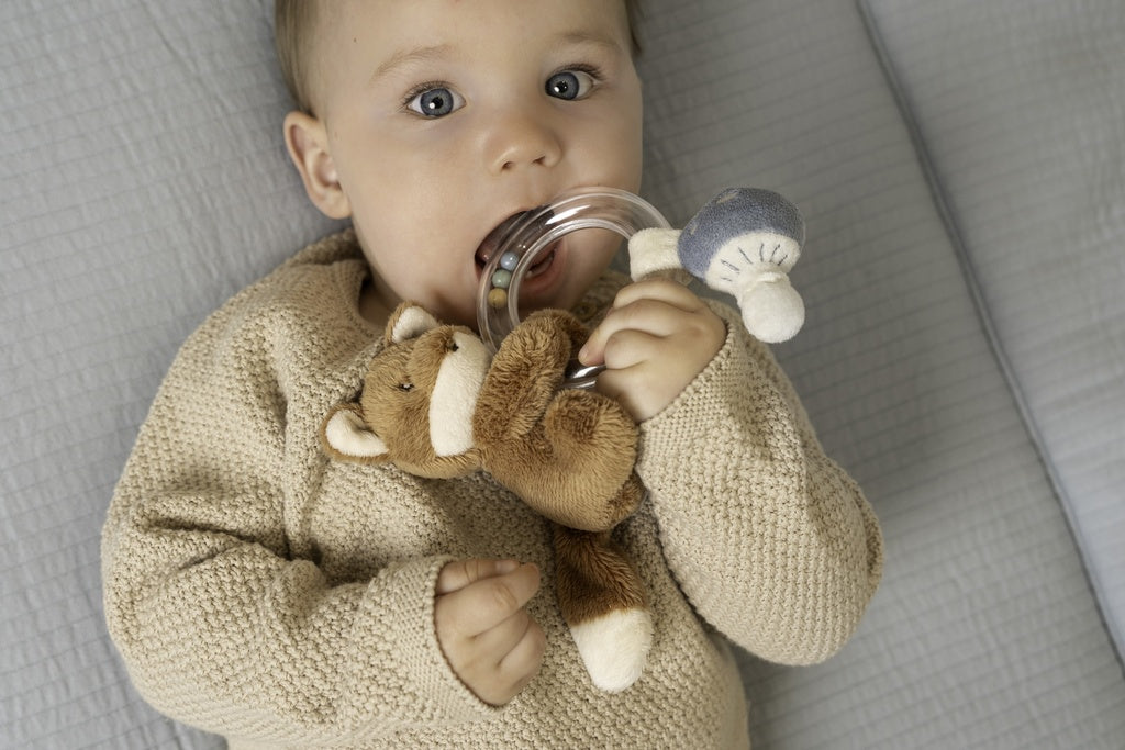 Louis le loup, le compagnon parfait pour les tout-petits dès 3 mois ! Avec sa double fonction, ce hochet anneau de dentition est conçu pour offrir à votre bébé une expérience sensorielle complète et apaisante. Avec ses dimensions idéales de 7 x 9 x 15 cm, il est facile à saisir par les petites mains, et permet de développer la motricité fine des petits. L’anneau de dentition rouge aide à soulager les poussées dentaires et offre un réconfort immédiat à bébé. Il est relié à la peluche Louis le loup par un ruban de satin, pour plus de sécurité. Louis le loup est une peluche toute douce et amicale, à l’image de notre personnage un peu pataud mais toujours prévenant. Sa texture douce et son visage souriant apportent réconfort et joie à votre enfant, il créera un lien affectif fort avec son hochet dès le plus jeune âge. Le hochet en peluche émet des sons subtils de clochette et de papier bruissant, qui stimulent l'ouïe de bébé et l'encourageant à secouer et à manipuler le jouet. Ces sons éveillent la curiosité de votre bébé tout en douceur. En plus de soulager les gencives douloureuses, le hochet de dentition Louis le loup aide à développer la vue, la motricité et l'ouïe de votre bébé. Les couleurs vives et les textures variées captivent son attention et l'incitent à explorer. Voilà un hochet polyvalent et super pratique ! Ce jouet d’éveil Lilliputiens est lavable en surface.