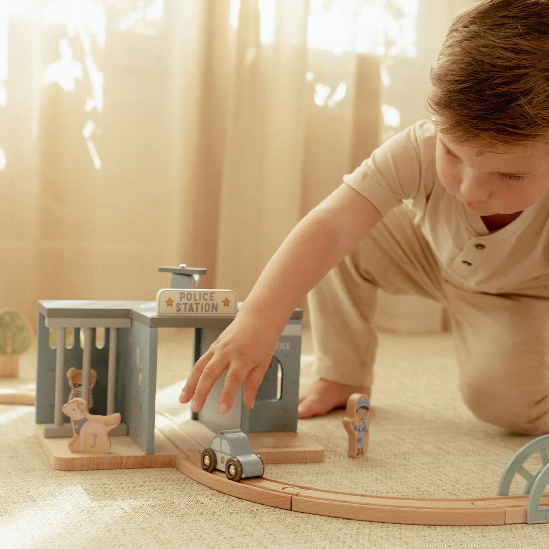 Pars à toute vitesse avec la voiture de police en bois du commissariat et attrape les malfaiteurs avec l’aide du chien policier et de l’agent ! Ce commissariat, de la marque néerlandaise Little Dutch, invite les petits héros à vivre de belles aventures. Embarque aussi avec l’hélicoptère ou la voiture de patrouille pour intervenir en un clin d’œil. Compatible avec d’autres circuits de train pour encore plus de jeu. Un jouet en bois FSC idéal pour les petits assistants pleins d’énergie !