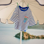 Ce t-shirt à la coupe boxy se distingue par ses fines rayures bleu et blanc au charme marin. Conçu dans une matière agréable composée de 97 % coton et 3 % élasthanne, il assure douceur, respirabilité et une légère élasticité pour un confort optimal. Son petit imprimé coloré sur la poitrine, inspiré de l’univers de l’océan, apporte une touche ludique et estivale. Facile à associer, ce t-shirt est idéal pour un look décontracté, frais et plein d’énergie. 🌊