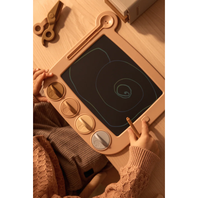 • Tableau à dessin en forme d'Ours avec écran LCD • Comprend un stylo et 4 tampons en silicone pour créer des formes instantanément • Une alternative réutilisable au stylo et au papier, facile à emporter partout • Fixation du stylo par l'oreille gauche et porte-stylo dans l'oreille droite • Appuyez sur le bouton à l’avant pour effacer l’écran ou sécurisez le dessin grâce au verrou à l’arrière • Une fois le dessin sécurisé, votre enfant peut continuer à dessiner, mais le bouton avant n'effacera pas l'écran • Pile bouton remplaçable incluse • Pour un temps de jeu immersif et d'exploration pour les petits esprits créatifs