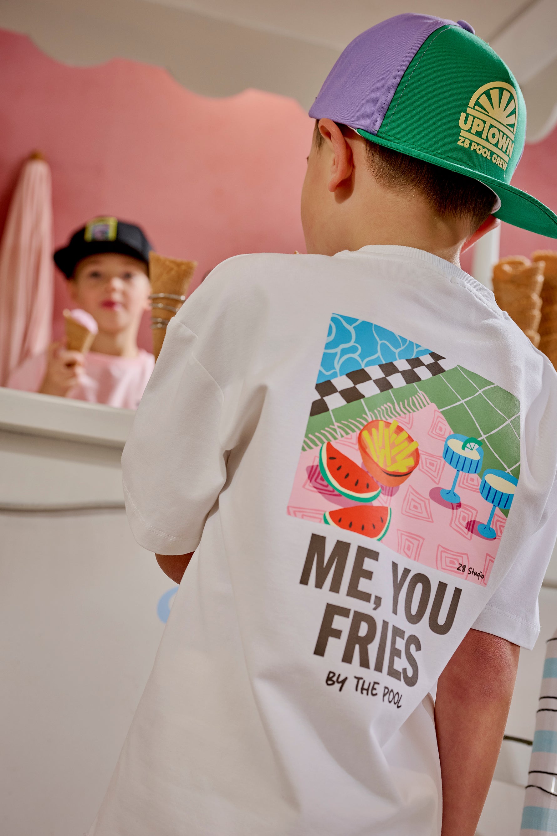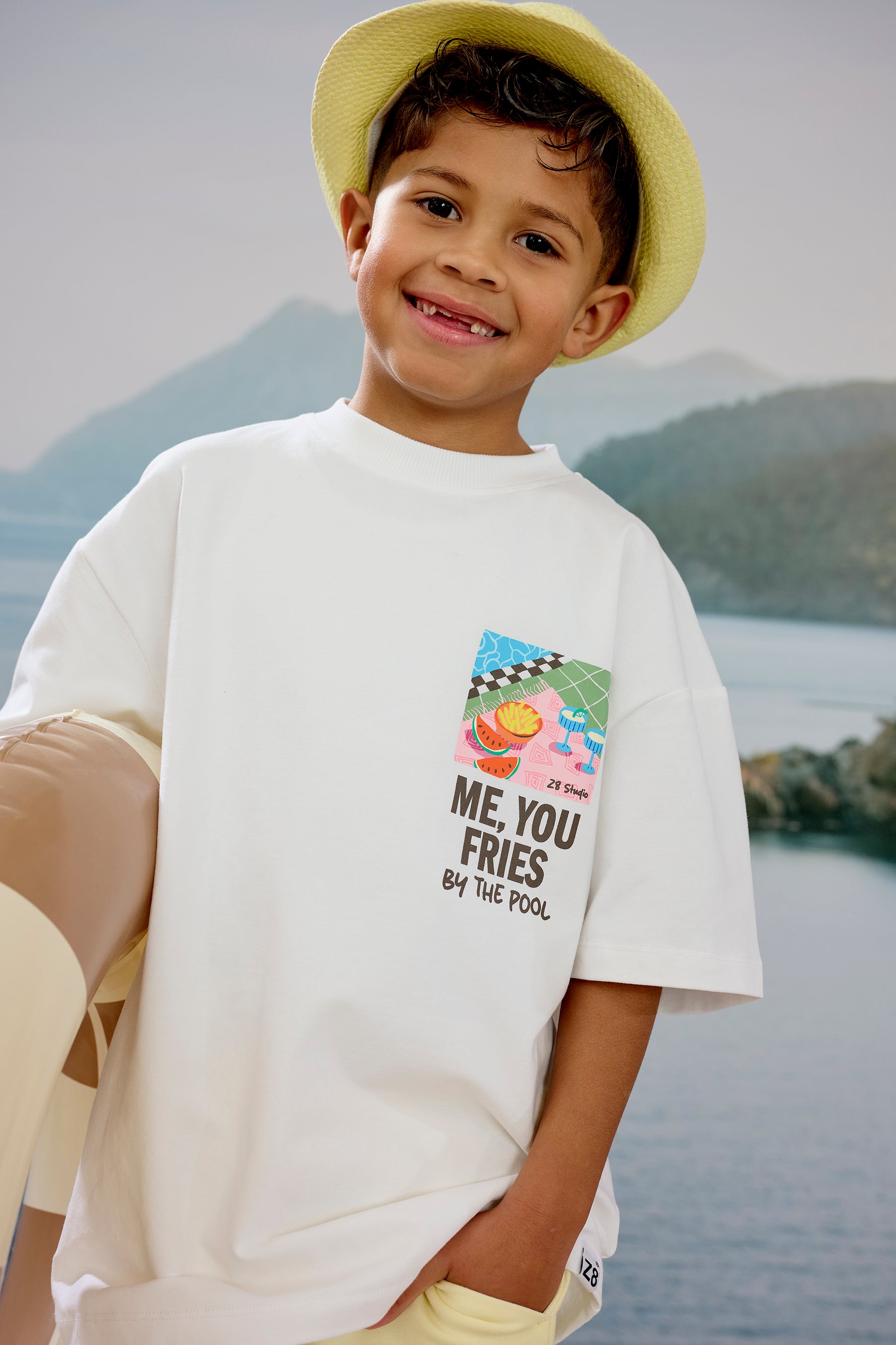 T-shirt blanc éclatant Zayd orné d'un imprimé amusant avec la phrase « me you and fries by the pool? » – l'accessoire parfait pour apporter une touche estivale à chaque tenue. Disponible en tailles 92 à 158, ce t-shirt combine confort et style ludique pour les enfants qui aiment exprimer leur personnalité avec humour.