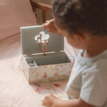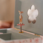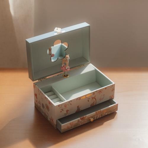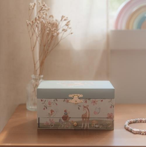 Machen Sie Ihrem Kind eine Freude mit einer persönlichen Schmuckkiste mit Musik! Diese farbenfrohe Schachtel mit den niedlichen Forest Friends bietet ausreichend Platz für den schönsten Schmuck oder andere wertvolle Gegenstände. Nach dem Aufziehen ertönt beim Öffnen der Schachtel Musik und ein kleines Reh beginnt vor dem Spiegel zu tanzen. Das perfekte Geschenk, an dem Ihr Kind ein Leben lang Freude haben wird!