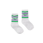 Hier entlang bitte! Gehen Sie stilvoll! Die Socken Ryze in strahlendem Weiß mit grünen und lila Streifen verleihen all Ihren Outfits eine verspielte und farbenfrohe Note. Sie sind in drei Varianten erhältlich und runden Ihren Look auf originelle und witzige Weise ab.