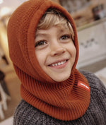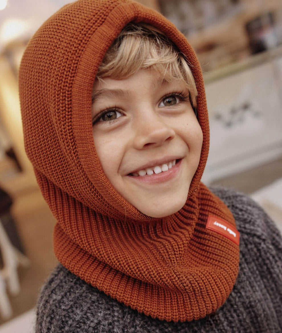 Entdecken Sie die Kapuze für Kinder und Babys, Hoody Nut. Weiches Rippstrickmaterial, gute Abdeckung, leicht anzupassen. Kann je nach Situation und Wunsch als Kapuze oder Halswärmer getragen werden. Perfekt für kalte Tage für Kinder!