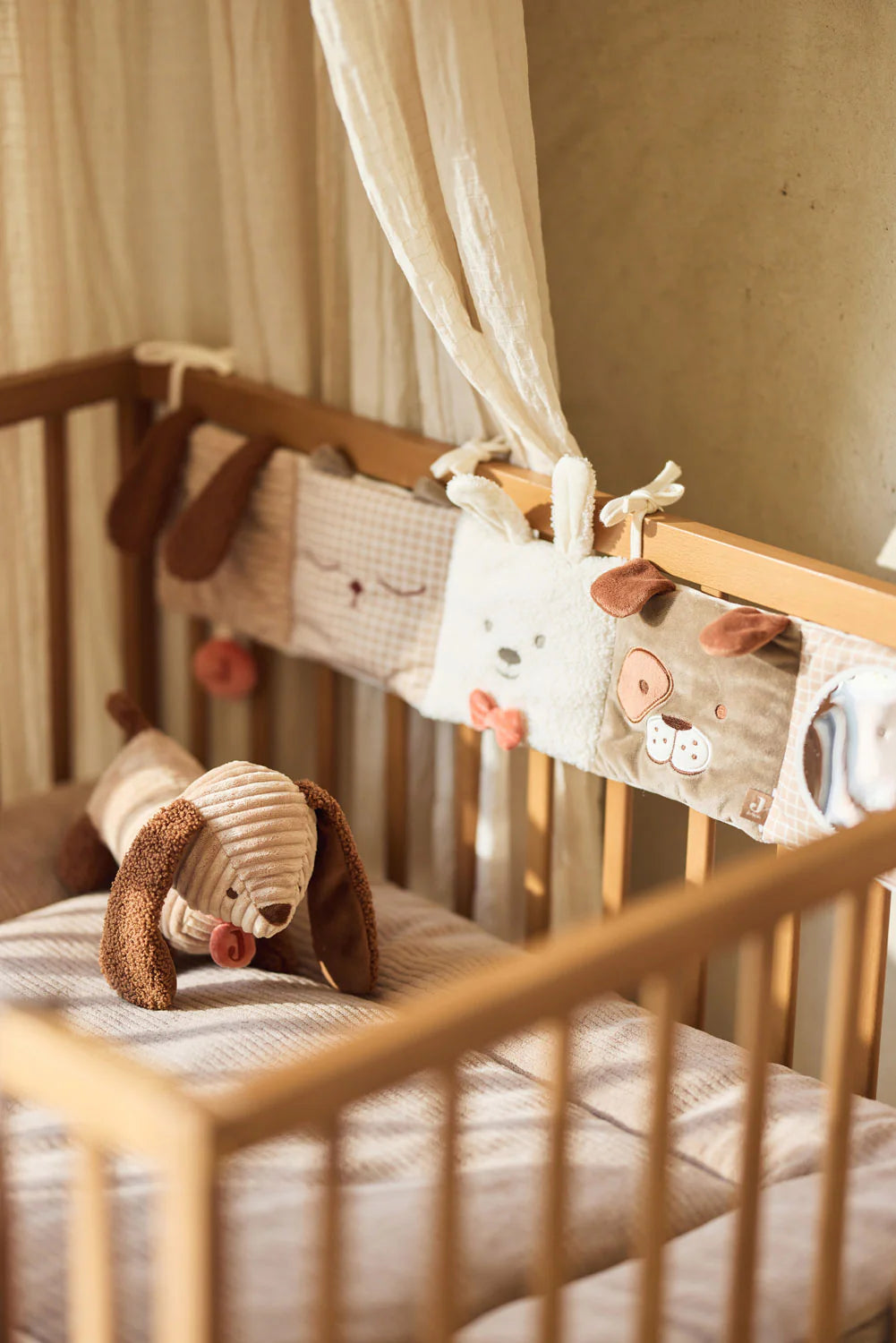 Ce jouet activité offre plein de possibilités de jeu : des petits miroirs pour éveiller la curiosité, des clochettes pour stimuler l’ouïe, du papier froissé pour explorer, et des tissus tout doux à câliner. Grâce aux cordons, il se fixe facilement au parc. C’est un cadeau de naissance idéal !