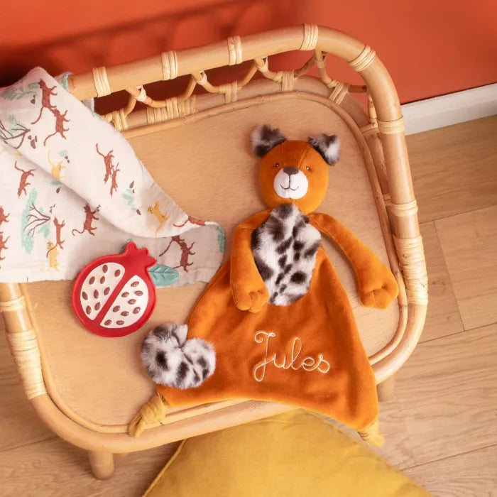 Das Kuscheltier „Taïgo, der Tiger“ mit seinem gefleckten Fell und seinen großen Pfoten. Sein Schwanz lässt sich an der Vorderseite mit einem Klettverschluss als Schnullerhalter befestigen. Er ist der perfekte Begleiter, um über das Baby zu wachen und für ruhige Nächte zu sorgen.