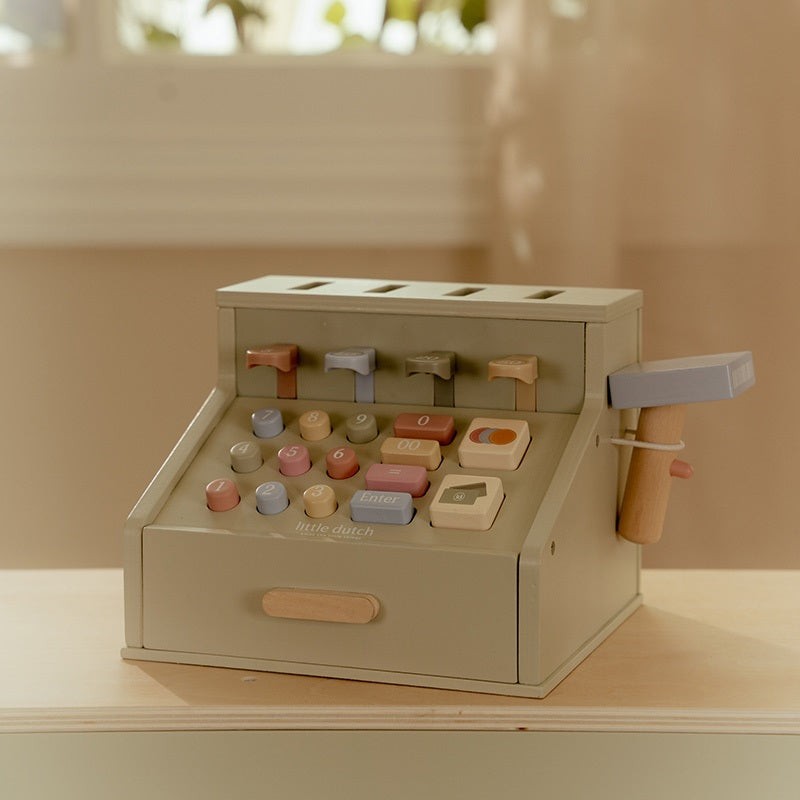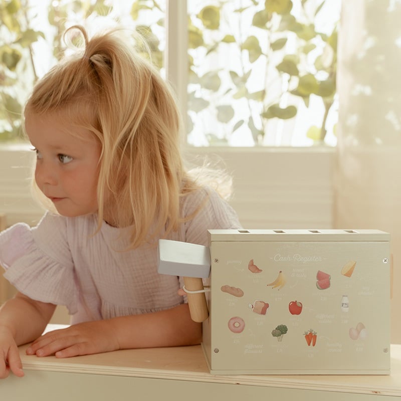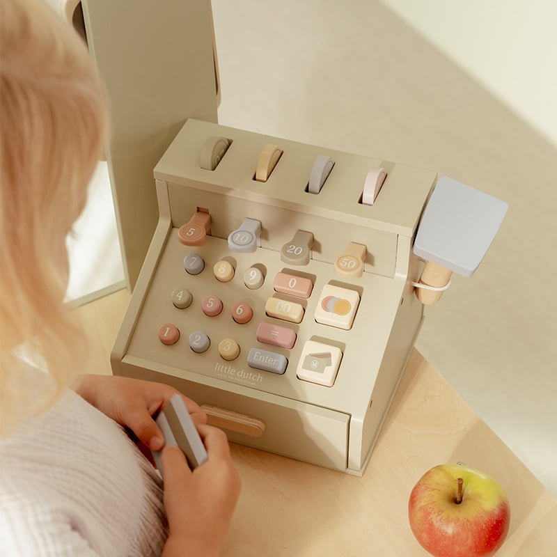 Zählen, scannen und bezahlen! Mit dieser Registrierkasse aus Holz wird das Rollenspiel „Kaufen und Verkaufen“ noch realistischer. Die Kasse ist mit einem Scanner, einem Kartenlesegerät, Tasten und einer Kassenschublade für Münzen und Scheine ausgestattet. Außerdem ist eine Bankkarte enthalten, mit der Kunden bar oder mit Karte bezahlen können. Eine fantastische Möglichkeit, sich auf spielerische Weise mit Geld und Zahlen vertraut zu machen. Was möchten Sie heute?