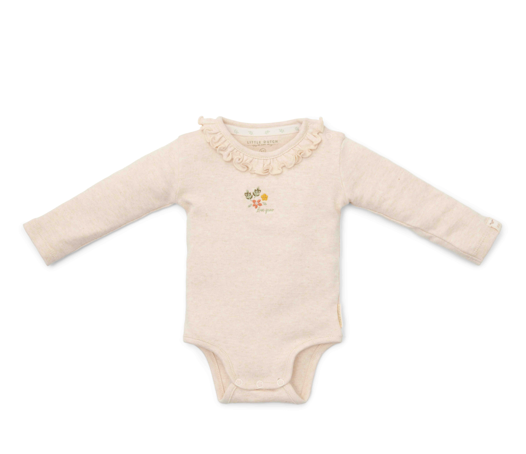 Mit diesem langärmeligen Body können Sie sich in eine kuschelige und charmante Umgebung kuscheln! Er ist aus weicher Bio-Baumwolle gefertigt und verbindet Komfort mit charmantem Design. Die sandfarbene Mischung ist mit einer hübschen Blattstickerei verziert. Für einen zusätzlichen Hauch von Eleganz sorgen Rüschen, die sich entlang des Ausschnitts kaskadieren und das Gesicht Ihres Babys mit bezauberndem Charme umrahmen. Ein Druckknopf im Schritt erleichtert das Windelwechseln. Kombinieren Sie ihn mit jedem anderen Teil aus der Newborn-Kollektion von Little Farm. Erhältlich in den Größen 44, 50, 56, 62, 68 und 74.