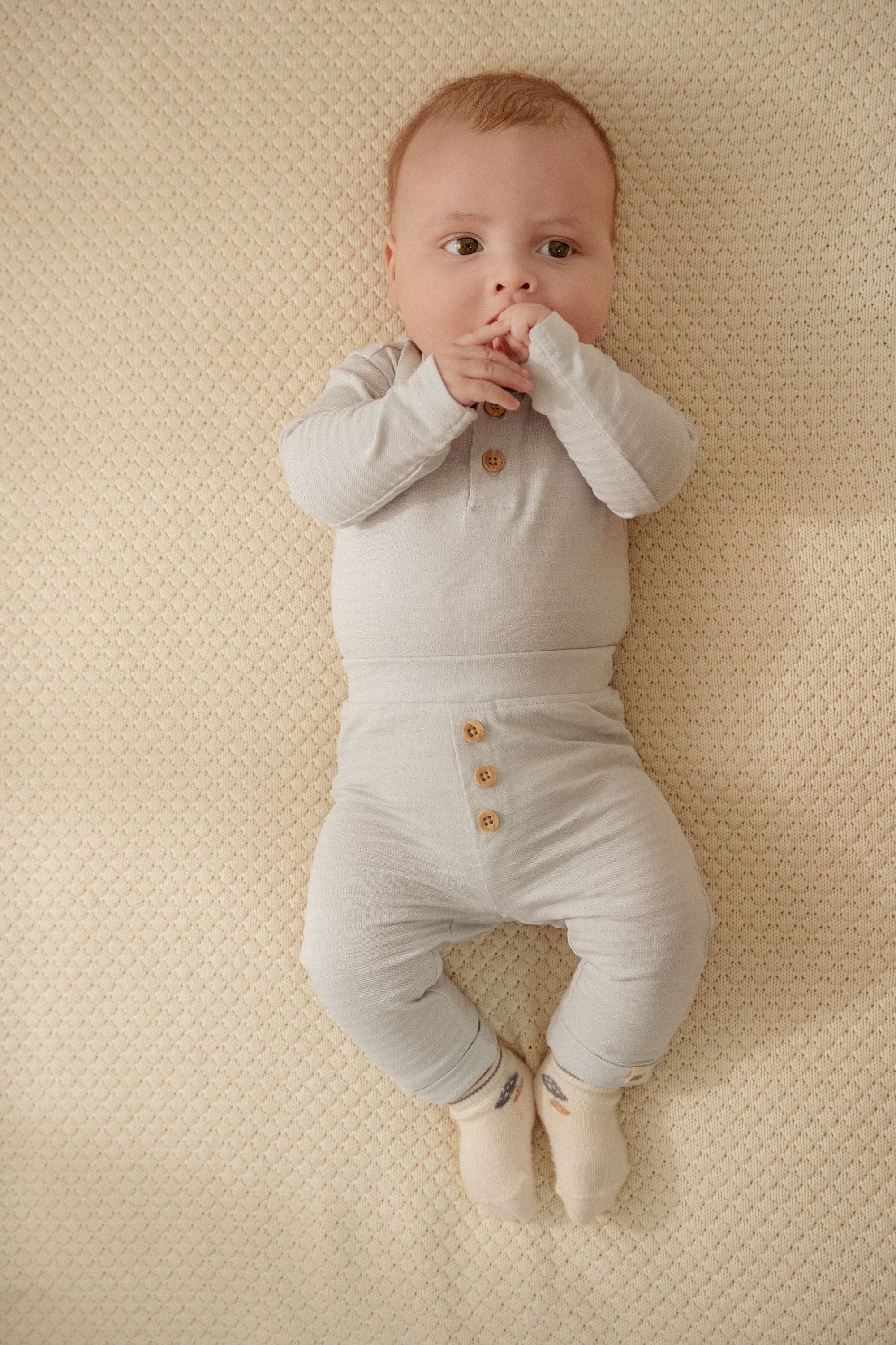 Enveloppez votre bébé dans un confort câlin avec ce body à manches longues en coton biologique doux. Son design intemporel est mis en valeur par des boutons en bois et un motif subtil de rayures. Le bouton pression pratique facilite le changement de couche. Disponible en tailles 50 à 74, il s'associe parfaitement avec la collection Forest Friends.