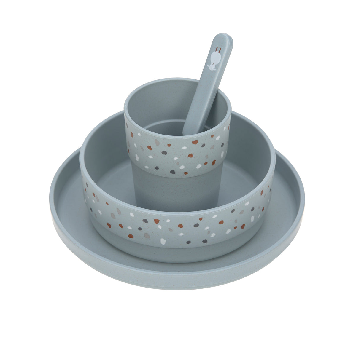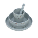 L’ensemble est composé d’une assiette, d’un bol, d’une tasse et d’une cuillère. Afin que la vaisselle reste en place sur la table, un anneau antidérapant en silicone est appliqué sur le dessous.