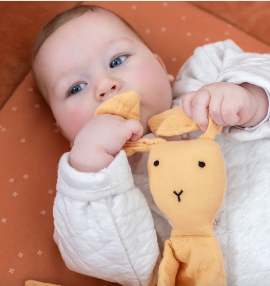 Ce petit doudou de 40x40cm accompagnera bébé dans son quotidien à la crèche, à la maison, chez mamy, ... Il apportera réconfort et tendresse quand votre enfant en aura le plus besoin.