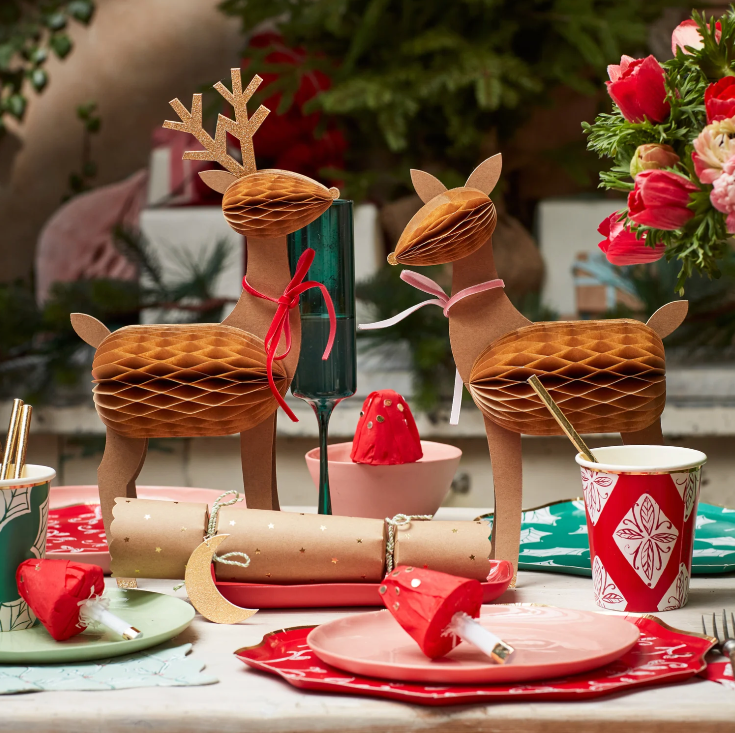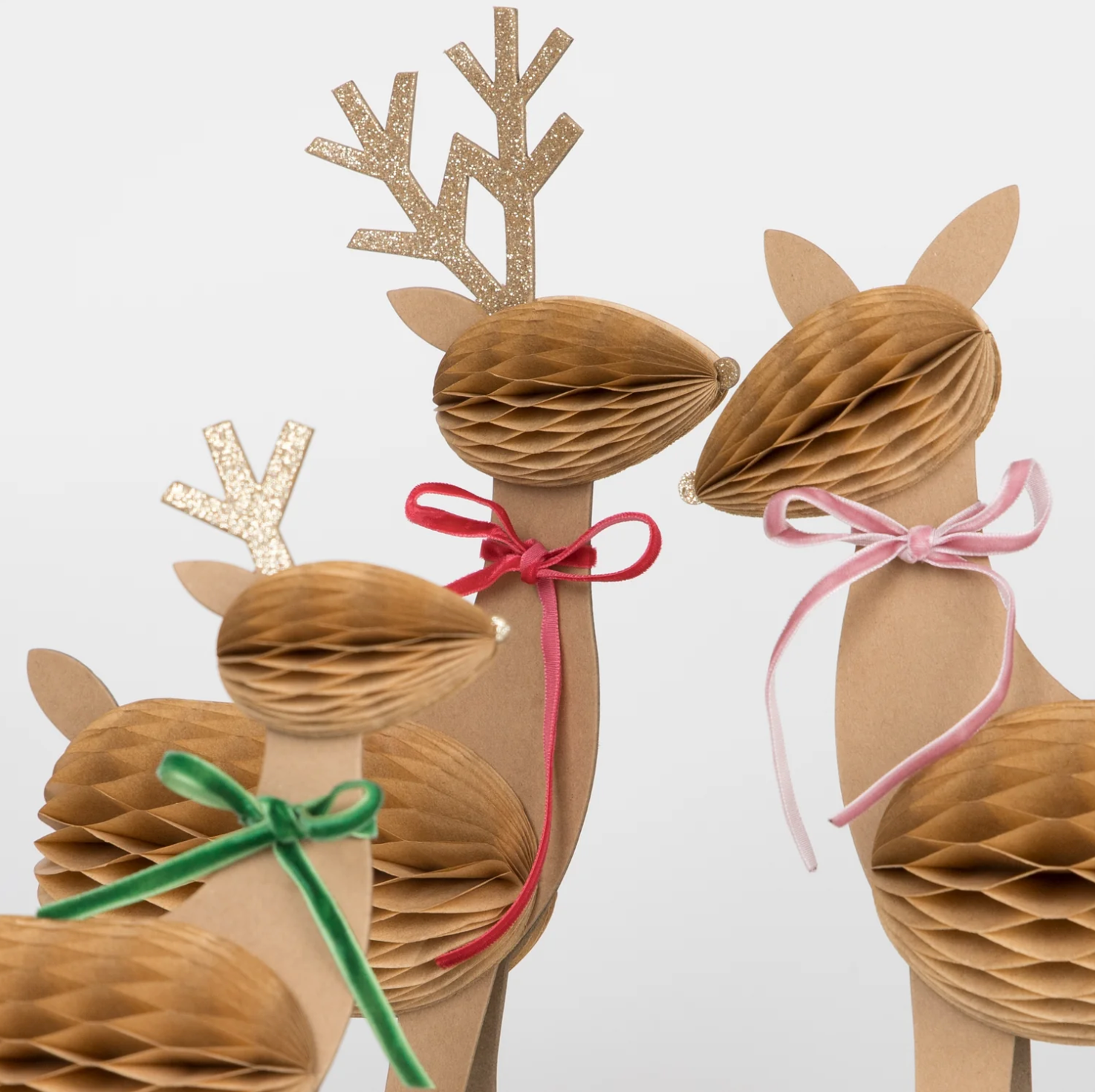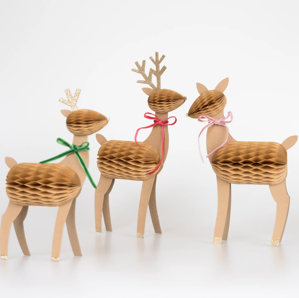 Cette famille de rennes 3D, joliment décorée de nid d'abeille, de rubans en velours et de paillettes, donnera un look enchanteur à vos festivités. Placez-les comme pièce maîtresse sur votre table de fête de Noël, dans votre porche, sur votre manteau ou partout où vous voulez une décoration de déclaration. Réutilisez-les chaque année pour apporter la magie de Noël chez vous.