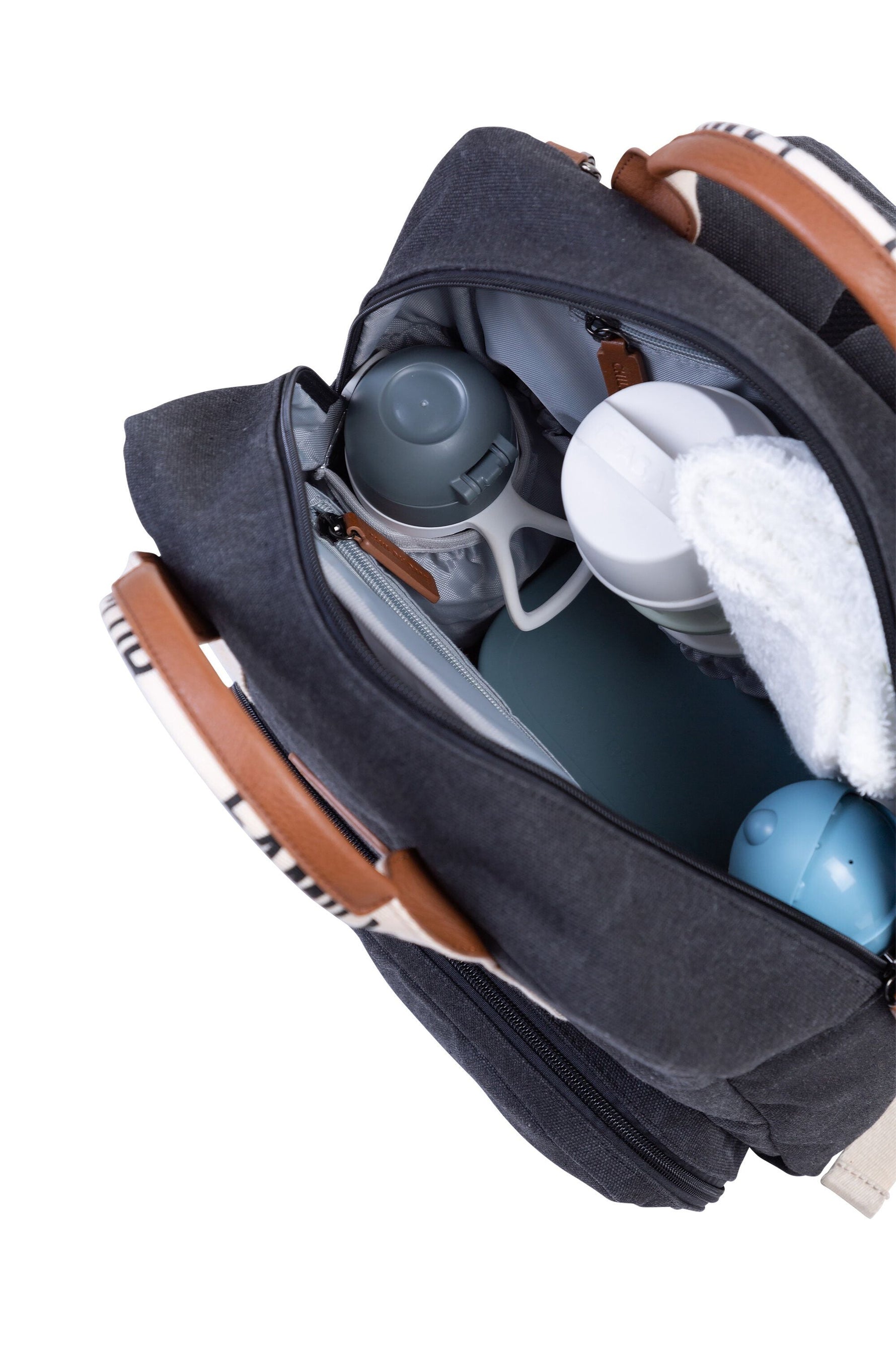 Ce sac fonctionnel et tendance offre tout l'espace de rangement et les accessoires dont une famille moderne a besoin :