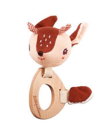 Une petite frimousse toute douce, un son joyeux et un anneau en bois à sucer font de ce hochet une expérience de chaque instant pour les tout-petits.