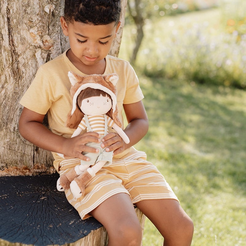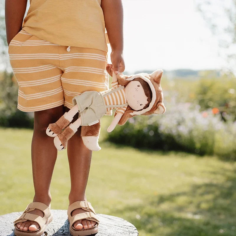 Voici l'ami de la forêt Sam, une poupée en peluche toute douce vêtue d'un adorable costume de renard. Avec le petit renard, Sam vous emmène à l'aventure dans la forêt, où ils ramassent toutes sortes de trésors forestiers tels que des champignons, des glands et des pommes de pin avec leurs amis les animaux. Sam est une peluche parfaite pour les petites mains. Son doux visage et sa tenue détaillée en font un compagnon de jeu idéal et une belle décoration pour la chambre d'enfant. Vivez les plus belles aventures dans la forêt avec l'ami de la forêt Sam !